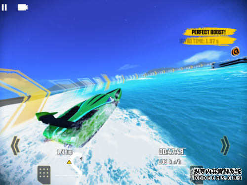 游戏玩法包括竞速和限时挑战等模式,初始只有两条赛道供玩家选择,随着比赛进程的深入将会解锁更多关卡。通过完成比赛获得的奖励可以用来购买高级赛艇或升级快艇的属性,也可以购买房屋、服饰等道具。
