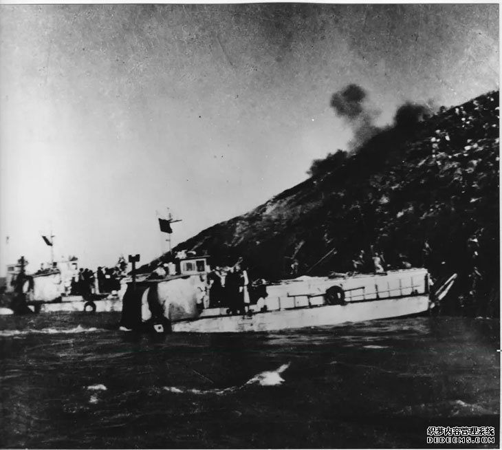 1955年1月18日,一江山岛战役中,陆海空三军官兵协同作战登上一江山岛。新华社发