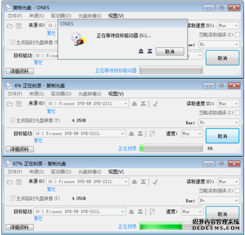 4、原盘读取完成后,光驱会自动弹出光盘,找传奇页游,并显示等待窗口,正在等待目标驱动器, 当放入空白光盘后,软件自动进入刻录复制步骤。