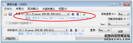 3、读取速度选择MAX,刻录速度选择MED中速。设置好后,点击刻录按钮,开始执行原盘读取。读取时间长短根据光盘类别和内容,DVD时间大约为6分钟,CD大约3分钟左右。
